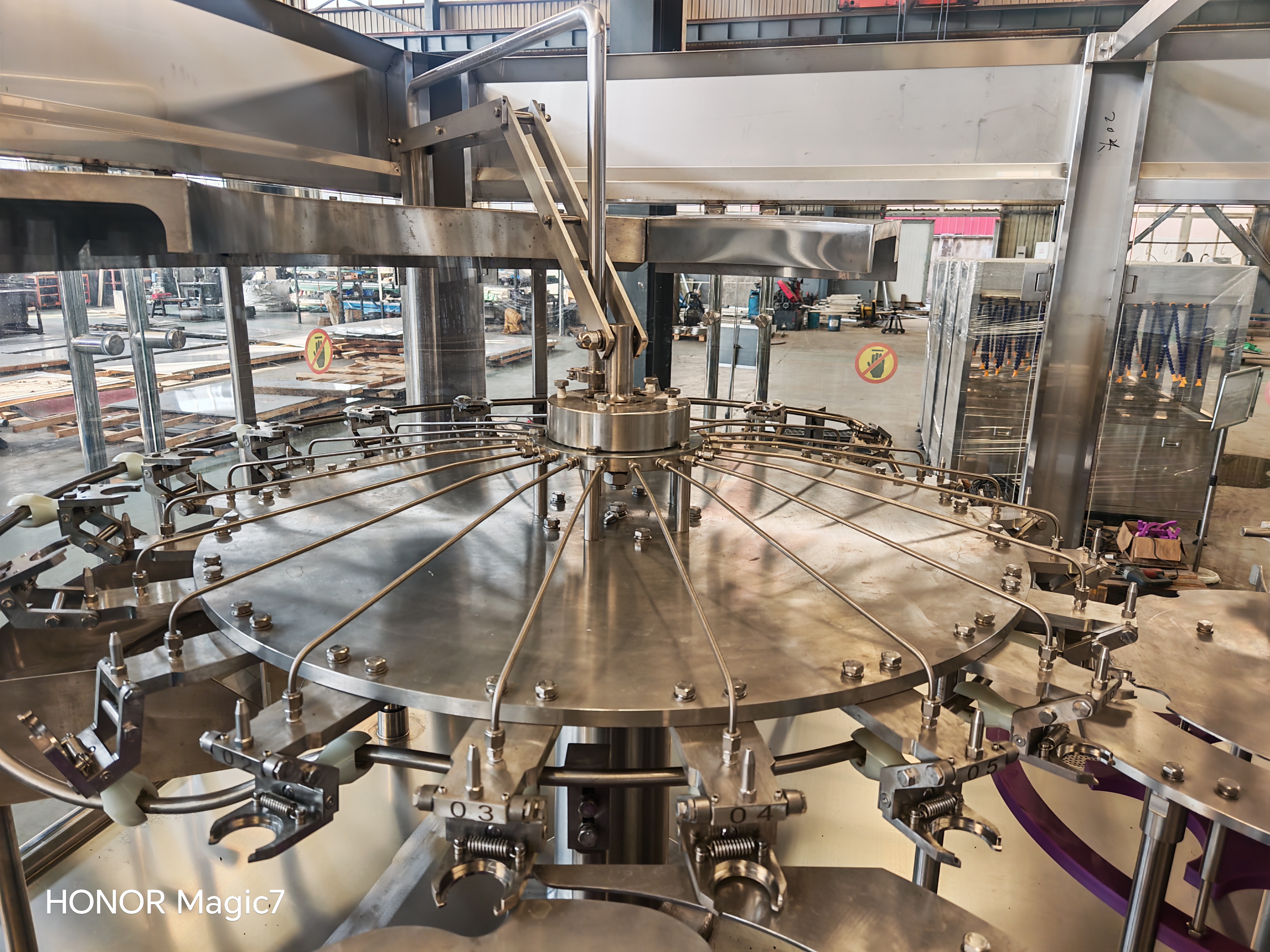 沖洗. 旋轉(zhuǎn)盤全部用不銹鋼加工而成。 大型平面帶齒軸承,運(yùn)轉(zhuǎn)平穩(wěn)、可靠。 采用本公司獨(dú)創(chuàng)的翻轉(zhuǎn)式不銹鋼卡瓶口瓶夾,瓶夾卡住瓶頸部位,避免了傳統(tǒng)瓶夾上的橡膠夾塊對瓶口螺紋部位造成的污染。 采用噴霧噴嘴,沖瓶水呈設(shè)定角度噴出,可沖洗到瓶子內(nèi)壁任何部位,沖洗徹底并節(jié)約沖瓶用水。 |